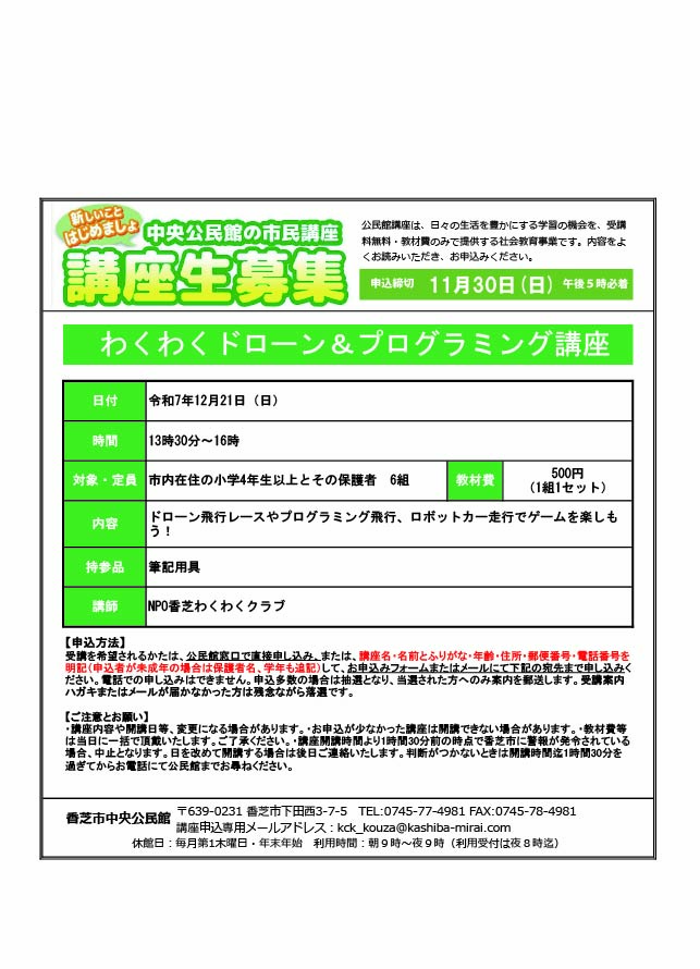 申込・問合先 令和7年11月30日(日)17時までに、中央公民館窓口、お申込みフォームもしくはメールにてお申込みください。